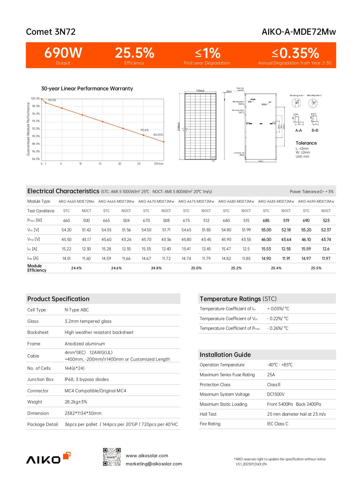 Dưới đây là thông số kỹ thuật tấm pin AIKO 660w, 665w, 670w, 680w, 690w thuộc dòng Comet 3N72 của AIKO Solar