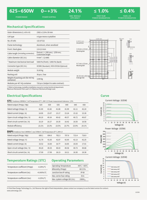 Thông số kỹ thuật tấm pin năng lượng mặt trời Astronergy 630W
