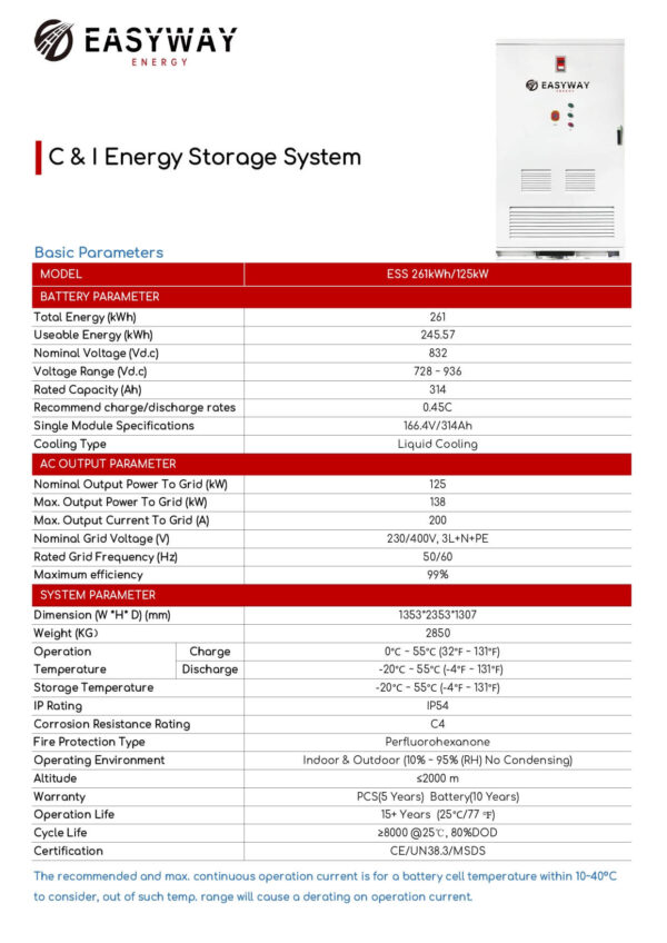 Thông số kỹ thuật của hệ thống lưu trữ Easyway ESS 261kWh/125kW