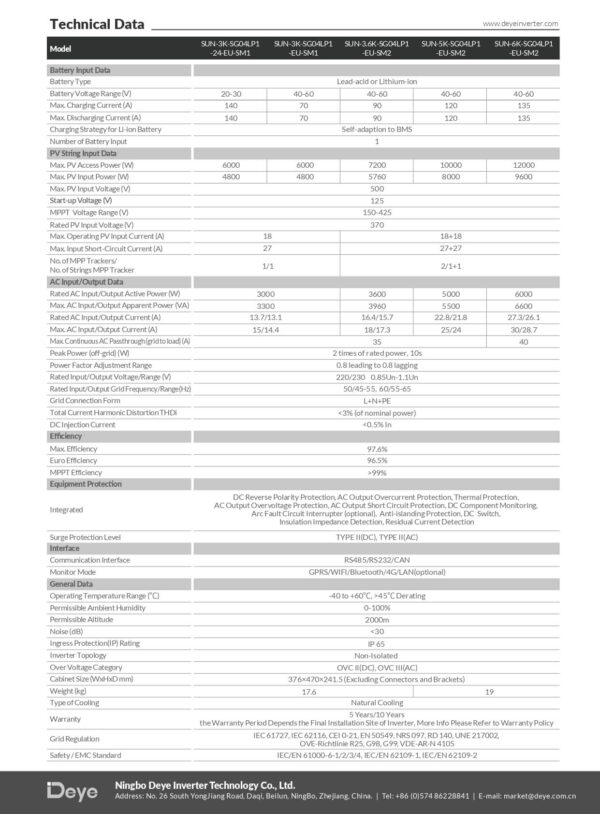 Datasheet Inverter Hybrid Deye 5kW SUN-5K-SG03LP1-EU