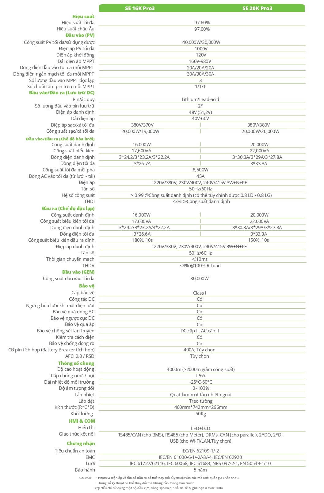 Thông số kỹ thuật của Inverter Senergy Hybrid 20kW 3 Pha Áp Thấp