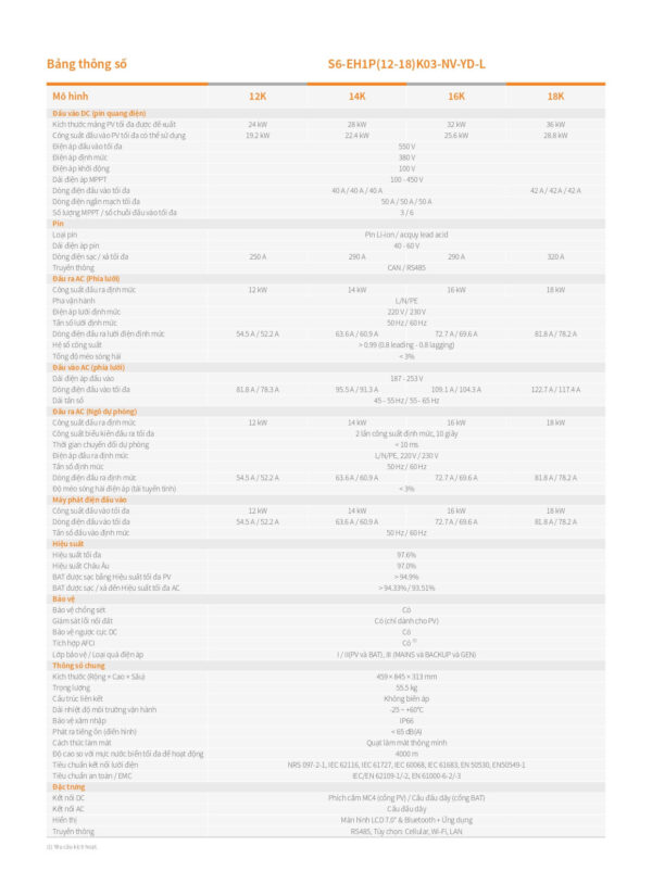 | Thông số Solis | S6-EH1P18K03-NV-YD-L |