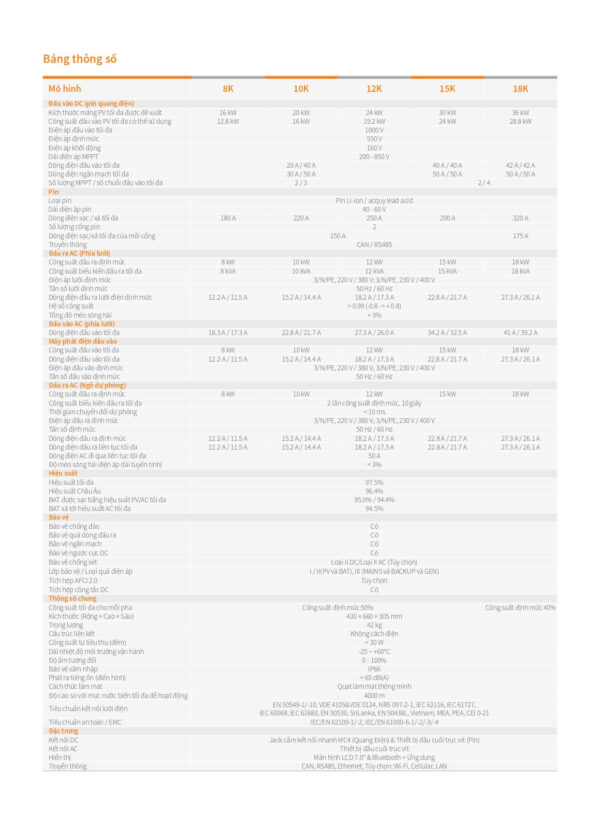 | Tiêu chuẩn kết nối lưới điện | G98 hoặc G99, VDE-AR-N 4105 / VDE V 0124, EN 50549-1, VDE 0126 / UTE C 15 / VFR:2019, RD 1699 / RD 244 / UNE 206006 / UNE 206007-1, CEI 0-21, C10/11, NRS 097-2-1, EIFS 2018.2, IEC 62116, IEC 61727, IEC 60068, IEC 61683, EN 50530, MEA, PEA |
