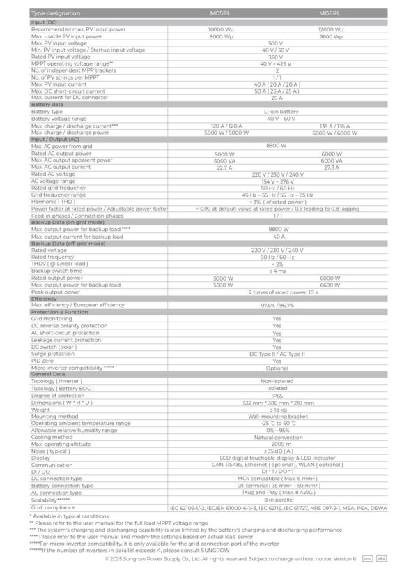 Datasheet Sungrow Hybrid 6kW MG6RL