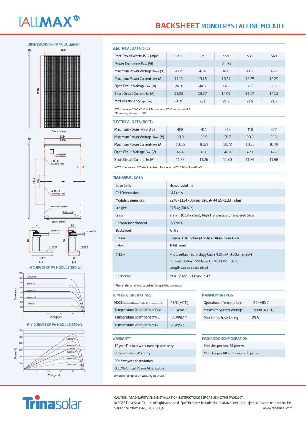 Datasheet tấm pin năng lượng mặt trời Trina 555W